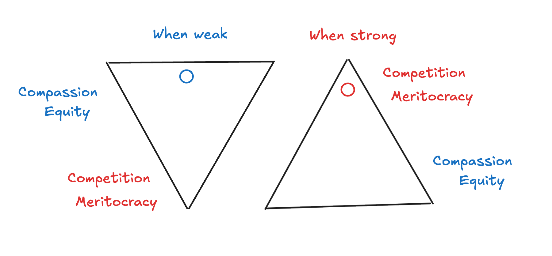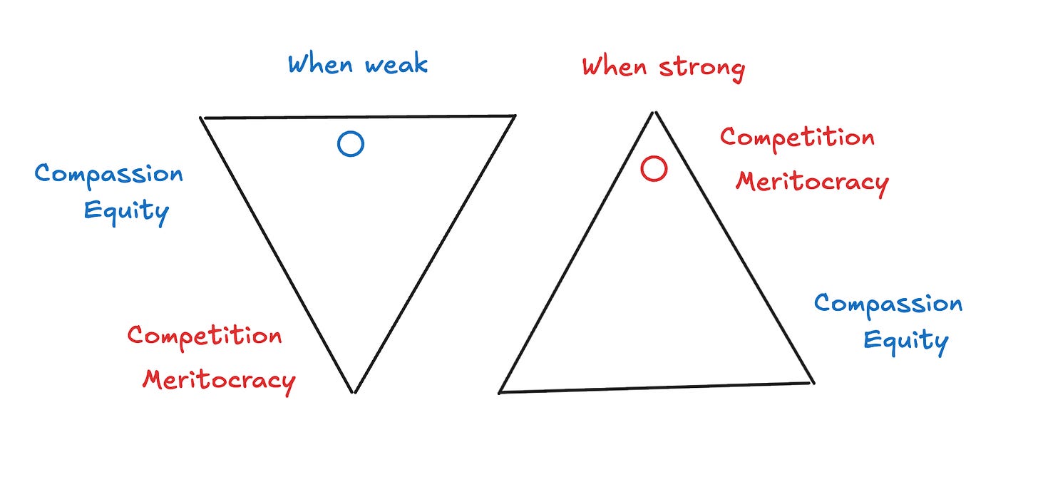 Each person builds a worldview that maximizes their own worth. The wealthy praise meritocracy, the poor elevate fairness. The strong glorify competition, the weak glorify compassion.