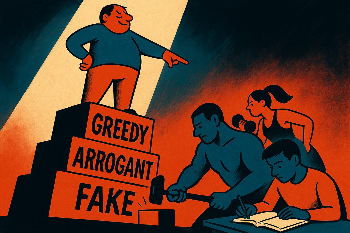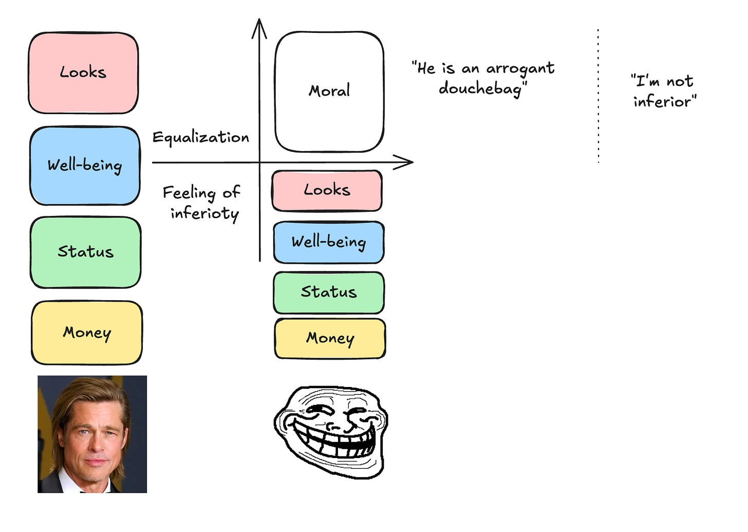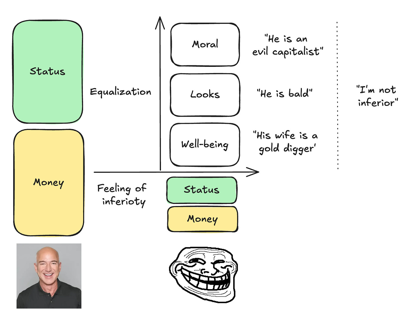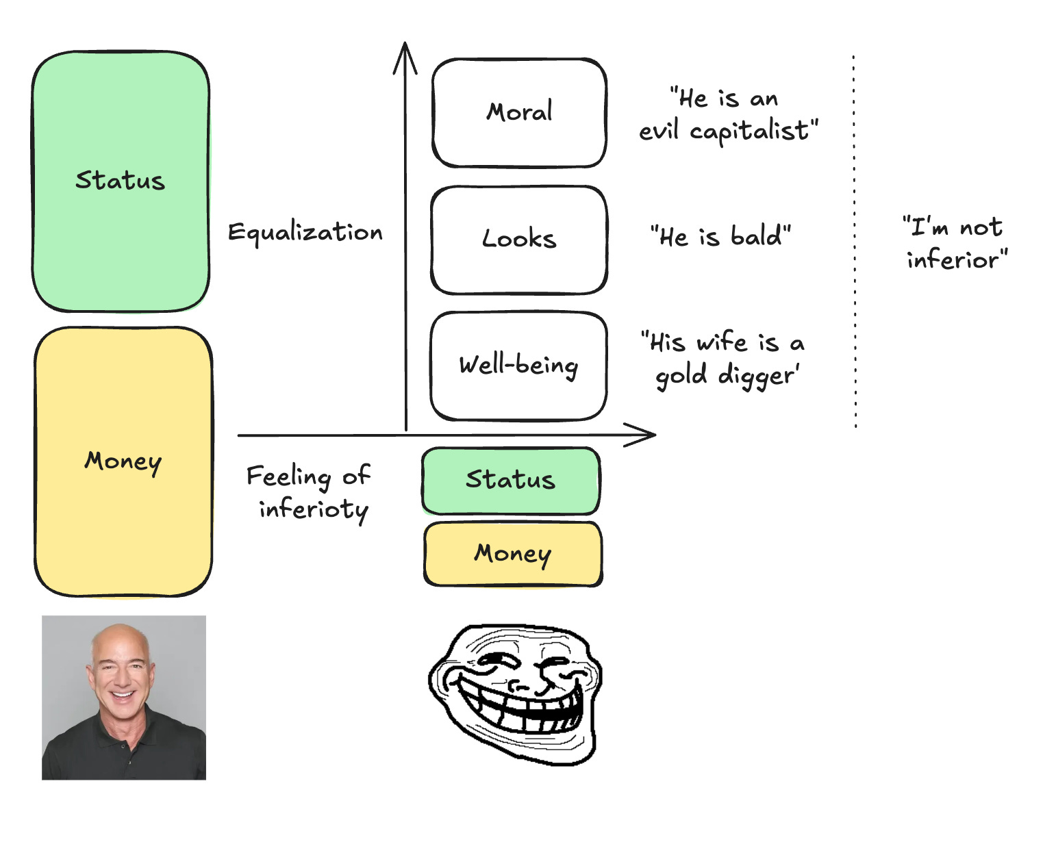 The same mechanism appears with wealth and status. See someone on a yacht? People rush to disqualify: he’s vulgar, he’s arrogant, probably corrupt.