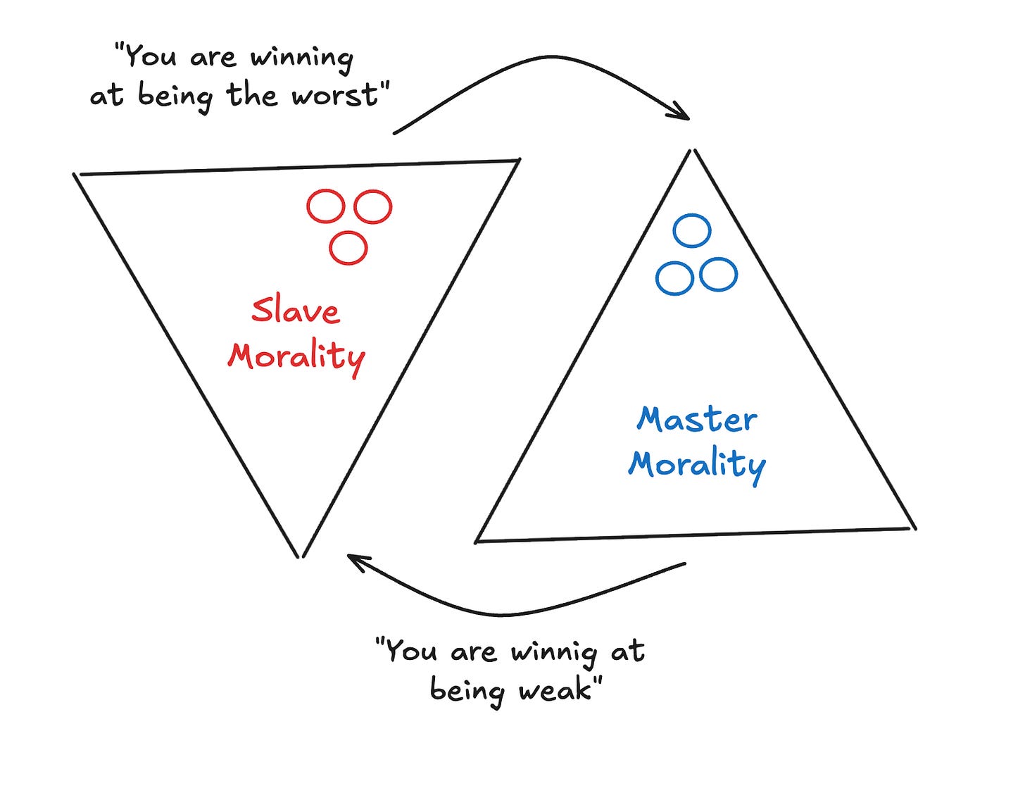 When weak, it clings to slave morality, painting the powerful as corrupt and elevating its own impotence into virtue.